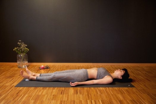Αφήστε τα πόδια να ανοίξουν στην ευθεία της λεκάνης, τα χέρια να ακουμπούν δίπλα στο σώμα, με τις παλάμες στραμμένες προς τα πάνω — ή αν προτιμάτε, τοποθετήστε τις παλάμες πάνω στην κοιλιά.